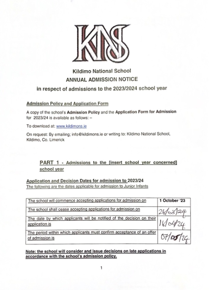 Kildimo National School ANNUAL ADMISSION NOTICE in respect of admissions to the 2024/25 school year
